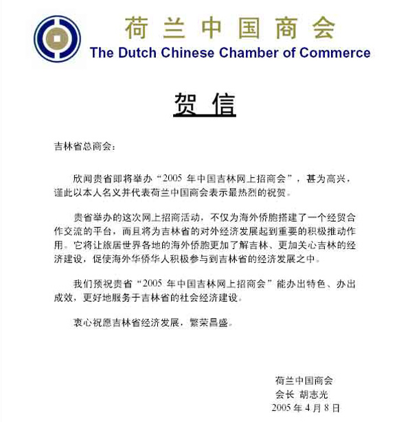 4月8日,荷兰中国商会会长胡志光先生代表荷兰中国商会向2005中国•吉林网上招商会发去贺信,预祝2005中国•吉林网上招商会取得圆满成功!(2005中国•吉林网上招商会:http://www.jilininvest.com/hdhh/hdhh.jsp)(荷兰中国商会贺信:http://www.jilininvest.com/hdhh/card/hollend.jpg)