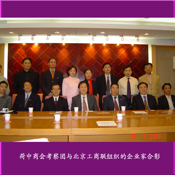 2003年9月30日,北京市工商联出面接待了由荷兰中国商会与欧洲美食家协会共同组织的荷兰中国商会访华代表团。 原统战部部长、现北京市海外联谊会会长沈仁道先生在北京市工商联的安排下,招待代表团成员,对去年他本人亲自到荷兰,商会接待过他的成员表示“有朋自远方来,不亦乐乎”。 在这次考察过程中,由北京市工商联组织的北京各会员企业与欧洲的同行们进行了相互的交流与沟通。北京市百万庄园的总裁陈立群对能有这样一个机会与来自欧洲的企业家进行合作与交流感到非常的高兴,双方企业家进行了历时两个小时的一对一的洽谈。 北京市工商联向荷兰中国商会赠送了象征双方友好合作的牌匾。